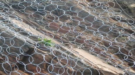 環(huán)形防護網(wǎng)采用熱鍍鋅工藝,在落石沖擊過程中能發(fā)生自身幾何形態(tài)改變、具有更為突出柔性特征的環(huán)形防護網(wǎng)來取代鋼絲繩網(wǎng),以此為基礎(chǔ)的攔石網(wǎng)能夠?qū)崿F(xiàn)3000kJ以上的落石阻攔,并能進一步簡化結(jié)構(gòu)形式(如支撐繩和減壓環(huán)的配置)、方便局部受損后的維護修復(fù),環(huán)形防護網(wǎng)已經(jīng)成為一種替代鋼絲繩網(wǎng)系統(tǒng)的新型攔石網(wǎng)(RXI型),實現(xiàn)了SNS被動防護系統(tǒng)的更新?lián)Q代和升級。